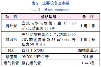 利用變頻技術及調整曝氣支管上的蝶閥開度來控制溶解氧。在曝氣區,異養菌利用氧氣將廢水中可降解有機物氧化為CO2和H2O,硝化菌將NH4+-N氧化為NO2--N或NO3--N,廢水循環向下至底部與原水混合時呈缺氧狀態,菌膠團中的反硝化細菌利用原水中的COd為碳源,將NO2--N、NO3--N反硝化為N2,剩余的COd和NH4+-N沿導流筒向上進入好氧區,實現整個反應器中的同步硝化反硝化。由于沒有NO2--N、NO3--N 的積累,在沉淀期內也不會因為反硝化產生N2影響沉淀功能。底部缺氧區在沉淀時起到了污泥選擇器的作用,能有效抑制污泥膨脹。反應器穩定運行時,采用較低的污泥負荷,污泥齡長,有利于硝化細菌的富集,且剩余污泥量少。反應器主體與配套設備的主要參數如表2 所示。