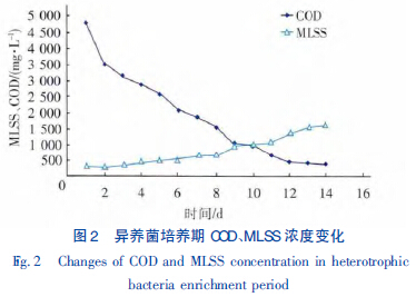 在溫度適宜、溶解氧充足和較高的污泥負荷等條件下,異養菌能夠利用廢水中的COd和氧氣快速增殖,表現在反應器內MLSS 持續增長,COd含量逐步下降。采用超越部分原水的方式補充好氧反應器的碳源,用于異養菌的培養與反硝化。異養菌培養期反應器內COD、MLSS 的濃度隨時間的變化關系如圖2 所示。接種污泥對豆制品廢水適應良好,反應第二天廢水的COd濃度從4 800 mg/L 降至3 500mg/L,由于接種污泥量太低,反應器內有機負荷過高,導致活性污泥粘性物質增多,反應器產生大量白色泡沫,現場采用降低反應器液位、噴淋消泡等手段消除泡沫影響,并保持曝氣充足,在第三天泡沫消失。前9 天反應器污泥負荷始終在1kgCOD/(kgMLSS·d) 以上,9 天后超越部分原水至反應器以維持此污泥負荷,有利于異養菌快速生長。經過14 天的培養,反應器內COd濃度降至400 mg/L 以下,MLSS 升高至1 500 mg/L 以上。