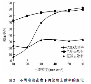 根據(jù)相關(guān)文獻(xiàn)和預(yù)備實(shí)驗(yàn),確定初始反應(yīng)條件:進(jìn)水pH 為5,電解時(shí)間為30 min,活性炭投加量為10 g/L。在此條件下,改變電流密度,考察其對(duì)三維電解效果的影響,結(jié)果如圖2 所示。