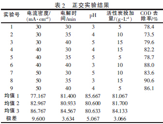 根據(jù)單因素實(shí)驗(yàn)結(jié)果,以電流密度、電解時(shí)間、pH、活性炭投加量為影響因素,COD 去除率為評(píng)價(jià)指標(biāo)(因影響因素較多,稀釋倍數(shù)法測(cè)定色度的方法不精確)進(jìn)行了正交實(shí)驗(yàn),結(jié)果如表2 所示。