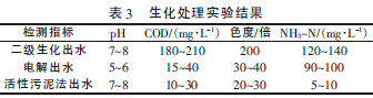因?yàn)殡娊獬鏊械陌钡容^高,所以需進(jìn)行電解后續(xù)的生化處理。接種污泥取自污水處理廠的二沉池,培養(yǎng)馴化過(guò)程中投入電解出水,逐步將處理水的投加量由5%增加至100%,直至出現(xiàn)指示生物,馴化過(guò)程歷時(shí)1 個(gè)月。將最佳電解條件下(電流密度50 mA/cm2,電解時(shí)間40 min,pH 為3,活性炭投加量15 g/L)處理的出水投入到馴化好的活性污泥反應(yīng)器中,在反應(yīng)溫度為25 ℃,曝氣時(shí)間為8 h 的條件下進(jìn)行生化處理,結(jié)果如表3 所示。