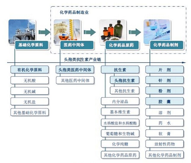 所謂醫(yī)藥中間體,實(shí)際上是一些用于藥品合成工藝過程中的一些化工原料或化工產(chǎn)品。這種化工產(chǎn)品,不需要藥品的生產(chǎn)許可證,在普通的化工廠即可生產(chǎn),只要達(dá)到一些的級別,即可用于藥品的合成。而頭孢類醫(yī)藥體就是生產(chǎn)頭孢類醫(yī)藥所需的醫(yī)藥中間體。附圖:化學(xué)藥品制造產(chǎn)業(yè)鏈。