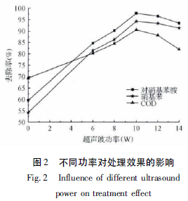 當超聲波功率從6 W 增至10 W 時,對硝基苯胺、硝基苯與COD 的去除率呈明顯上升趨勢,在功率為10 W 時去除率達到最大。功率增大,意味著超聲在廢水中所產生的負壓和正壓均變大,空化泡周期性的膨脹和壓縮強度相應變大,在廢水中產生的微聲流增強。微聲流的增強必定導致細胞通透性的增加,污泥的活性也隨之增強,處理效果逐漸提高。