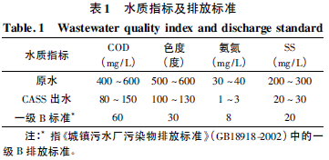 浙江省某印染制革園區(qū)污水處理廠進水中制革廢水約占50%,印染廢水約占40%,其他工業(yè)廢水約占10%,經(jīng)“水解酸化+ CASS”處理后,出水COD 和色度仍未能達到《城鎮(zhèn)污水廠污染物排放標準》一級B排放標準要求,具體水質(zhì)指標及排放要求如表1 所示。