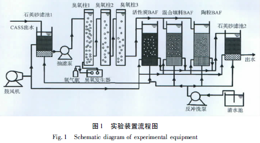 O3-BAF 中試裝置如圖1 所示。實驗用水CASS出水經(jīng)潛水泵打入前端石英砂濾池1,去除SS 以減少進入臭氧柱內(nèi)的懸浮物濃度。石英砂濾池出水經(jīng)抽濾泵打入第1 根臭氧柱內(nèi),同時在第1 根臭氧柱內(nèi)通入臭氧發(fā)生器(青島國林CF-G-3-30 型,采用氧氣源供氣)產(chǎn)生的臭氧,再依次通過第2、3 根臭氧柱確保臭氧與有機物充分接觸反應并去除多余臭氧。臭氧氧化出水分別以相同流量并聯(lián)流入活性炭BAF、混合填料BAF 以及陶粒BAF,濾池出水進入后端石英砂濾池2 去除BAF 運行過程中脫落的生物膜等懸浮物,保證出水SS 達到一級B 排放標準。臭氧反應柱和BAF 都采用向下流方式運行,氣水逆向。濾池反沖洗采用先氣沖后氣水聯(lián)合反沖方式,其中氣沖強度15 L/(m2·s),氣沖時間10 min,水沖強度10 L/(m2 · s ),氣水聯(lián)合反沖時間20 min。