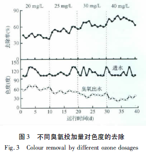 不同臭氧投加量對色度去除效果如圖3 所示。進水色度較高,在100~125 度,經(jīng)過不同濃度臭氧氧化后出水色度在20~70 度,總平均去除率為60%。臭氧投加量為20、25、30 和40 mg/L 時,色度平均去除率分別為42.7%、54.3%、63.6% 和73.1%; 臭氧一方面破壞了發(fā)色或助色基團,從而表現(xiàn)出對色度的高效去除; 另一方面又改變了部分發(fā)色或助色基團的結構,有利于后續(xù)BAF 的進一步去除。當臭氧投加量由20 mg/L 增至25 mg/L時,色度平均去除率增加11.6%,而由25 mg/L 增至40 mg/L 時,色度的平均去除率只增加18.8%。開始時臭氧對水溶性染料脫色效果較好,去除率較高,隨著水溶性染料物質(zhì)的分解氧化,繼續(xù)增加臭氧投加量對色度的去除效果增加不明顯。綜合考慮臭氧投加量增加導致運行成本顯著增加及對COD 和色度的去除效果,確定臭氧投加量為25 mg/L 時較為合理。