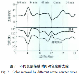 不同臭氧接觸時間對色度的去除效果如圖7 所示。進水色度波動較大,在90~145 度,經(jīng)25 mg/L且投加比6∶ 3∶ 1 臭氧氧化后出水色度波動也較大,在44~100 度。在不同的臭氧接觸時間內(nèi),臭氧對進水色度的平均去除率變化不大,接觸時間從168降到30 min,色度平均去除率分別為36.8%、33.9%、31.7%、33.1% 和33.3%。色度所反映的是大分子或碳碳雙鍵類物質(zhì),在較短時間內(nèi),臭氧即可將該類物質(zhì)氧化為有機酸和醛類等小分子物質(zhì),因此綜合考慮COD 和色度去除效果,選擇臭氧接觸時間為42 min 較為合理。