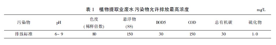 1.3植物提取物生產過程中廢水的排放標準我國早在1973年就首次頒布了《工業“三廢”排放試行標準(GBJ4-73)》,對排入地面水的工業廢水中19項污染物或有害因素的排放標準進行了規定。1988年國家環境保護局重新修訂頒布污水綜合排放標準《GB8978-88)》,適用于排放污水和廢水的一切企事業單位。現在執行的標準是1996年10月4日批準,并于1998年1月1日實施的《污水綜合排放標準(GB8978-1996)》,按其規定,植物提取行業廢水的排放依照該標準執行。標準規定的植物提取行業廢水排放標準值見表1。