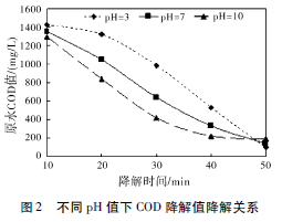 在反應槽內加入不同pH 值的實驗原水,進行實驗。每隔10 min 取樣測試一次COD值。