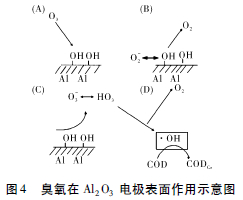 在堿性的時候,臭氧此時在Al2O3的催化作用下,臭氧在Al2O3表持續不斷地轉化成·OH,此時水中有機物濃度較高,·OH 與原水中的有機物反應,此時反應快,作用效果明顯。隨著反應的推進,有機物濃度在降低,而此時依舊有持續的·OH 產生。加上此時的電極電解在低濃度下,陽極也發生間接反應,必然也會產生大量的·OH,此時的·OH 必然累積,當累積一定程度的時候,·OH 之間也會相互作用而淬滅,造成·OH 大量減少,其反應過程如圖4 所示。此反應過程中就涉及到臭氧的投加的方式和量上的優化。