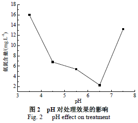 從反應(yīng)效果來看,pH 過低、過高處理效果均不理想。因整個反應(yīng)過程會產(chǎn)生酸,pH 過低,則制約反應(yīng)(3)進行,達不到預(yù)期效果。而pH 過高,則影響次氯酸鈉分解成有效氯,從而影響處理效果。因此pH=在5.5~6.5 氨氮去除效果是最好的。