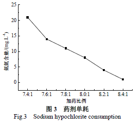 通過實驗可看出,在氨氮低于100 mg/L 的原水中,按m(Cl2)∶m(NH4+)=8.0∶1,處理效果好,可達到排放要求?紤]到水質(zhì)可能有所變動和次氯酸鈉的不穩(wěn)定性,因此生產(chǎn)上建議采用最佳的藥劑質(zhì)量比為m(Cl2)∶m(NH4+)=8.0∶1~8.2∶1 之間,雖藥劑量越大處理效果越好,但這樣不僅造成成本增加,更有可能會使水中余氯增多,導(dǎo)致二次污染。
