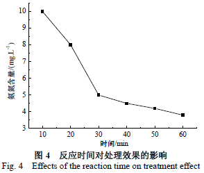 從實驗過程看,隨著反應(yīng)時間的延長,氨氮的濃度逐步下降。10~30 min 之間,氨氮下降幅度很大,效果很明顯。但是反應(yīng)時間繼續(xù)延長,由于藥劑幾乎消耗完全,氨氮下降的幅度很小了。因此,為了提高整個處理效率,反應(yīng)時間為30 min。