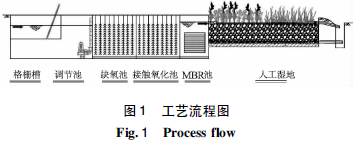 根據本項目水質目標,從保障出水效果、便于自動化運行、節約投資和運行維護費用等方面考慮,主體采用“膜生物反應器+ 人工濕地”組合工藝,具體工藝流程如圖1。