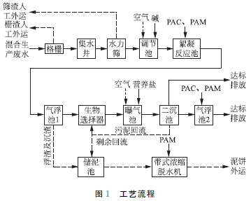 豆制品生產(chǎn)廢水排放不均勻,水質(zhì)水量波動(dòng)性很大;廢水所含懸浮物、細(xì)顆粒物濃度高,易酸敗變臭,pH 較低,對(duì)預(yù)處理單元、管道設(shè)備易產(chǎn)生不利影響。為此本工程采用以下措施來(lái)強(qiáng)化預(yù)處理:粗格柵和水力篩對(duì)廢水中較大的固形物以及豆渣等顆粒物有效去除;調(diào)節(jié)池預(yù)曝氣防止廢水過度酸化和沉渣上浮;混凝氣浮去除大部分的懸浮物和細(xì)顆粒物。針對(duì)混合廢水平均COD 不高(2 000~3 000mg/L),大部分污染物可通過強(qiáng)化預(yù)處理去除的特點(diǎn),本工程采用改良的活性污泥法作為主體工藝,通過生物選擇器的設(shè)置以及營(yíng)養(yǎng)鹽的合理調(diào)配,實(shí)現(xiàn)廢水連續(xù)穩(wěn)定達(dá)標(biāo)處理,既避免了厭氧處理較復(fù)雜的運(yùn)行管理要求、啟動(dòng)馴化時(shí)間長(zhǎng)、較大的堿消耗量以及運(yùn)行不穩(wěn)定易受沖擊等問題,又克服了豆制品廢水好氧處理過程易產(chǎn)生的絲狀菌污泥膨脹的缺點(diǎn)。本工程在生化處理系統(tǒng)后還設(shè)置了后氣浮單元作為備用設(shè)施,在預(yù)處理或生化系統(tǒng)運(yùn)行不正常時(shí)開啟,保證最終出水達(dá)標(biāo)排放。工藝流程見圖1。