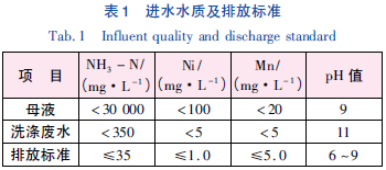 天津某公司生產三元層狀氧化鎳錳鈷鋰,其中在過濾工藝后產生高濃度氨氮母液50m3/d,洗滌工藝后產生低濃度氨氮洗滌廢水140 m3/d,無其他生產廢水。設計進水水質及排放標準見表1。