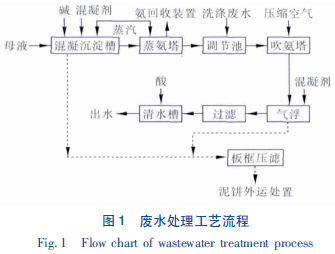 該企業生產廢水含氨氮濃度高,可生化性差,適合采用物化法處理?紤]到廠內有自用燃氣鍋爐制備蒸汽,其洗滌工藝中用到堿液和軟水,因而可降低廢水處理建設投資和運行成本。工藝流程見圖1。