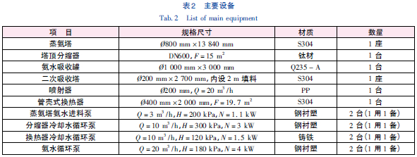 氨洗原理: 依據化學吸收原理,用軟水(初始)或稀氨水吸收氣態氨生成氨水,并放出大量熱,利用冷卻裝置將熱量移走,使氨水溫度控制在35 ℃。來自蒸氨塔的氨蒸汽經塔頂分縮器冷凝后進入噴射器,與來自氨水吸收槽經冷卻后的循環氨水混合吸收,生成濃度>10%的氨水,在吸收槽頂部設置1 座二次吸收塔,補入系統的軟水由塔頂加入,可進一步減少氨氣排放量。塔頂分縮器和循環氨水冷卻用水水源來自調節池。主要設備見表2。