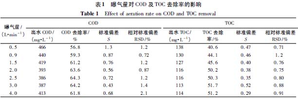 由表1 可知,曝氣量在0.5—2.0 L·min-1時,COD、TOC 去除率隨曝氣量增大而升高,繼續增大曝氣量,COD 及TOC 的去除率上升并不明顯,甚至還出現下降趨勢.這表明適當曝氣有利于有機物的氧化,但曝氣量過大,Fe3+與HO -2的反應受抑制,使Fe2+的催化作用減弱,從而降低有機物去除率,且處理效果不穩定。因此,本試驗選用曝氣量為2.0 L·min-1 .
