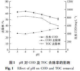 圖1 表明,在pH 3—8 范圍內,隨廢水pH 值的升高,出水COD 值增大,COD 及TOC 的去除率減小.當pH = 4 時,處理效果最佳,COD 及TOC 的去除率分別為63.8% 和55.5%,此時,繼續降低或提高反應的pH,COD、TOC 的去除率皆呈現下降趨勢.這是由于中性或堿性環境抑制了·OH 的產生,雖然Fenton 試劑在堿性條件下對部分有機物具有一定的降解能力,但堿性條件下,Fe2+會以氫氧化物的形式沉淀,從而失去對H2O2的催化能力; pH 過低時,溶液中H+過高,Fe3+的還原反應受阻,影響Fe2+對H2O2的催化反應順利進行,從而影響Fenton 試劑對有機物的降解能力.