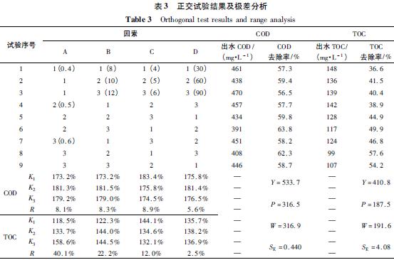 表3 表明,影響COD 去除率的因素主次順序為,pH > H2O2投加量> Fe2+投加量>反應時間,得到最佳工藝參數組合為A2 B2 C1 D2; 影響TOC 去除率的因素主次順序為,Fe2+投加量> H2 O2投加量>pH >反應時間,得到最佳工藝參數組合為A3B3C1D2 .根據污水處理“投入最小化,處理效果最優化”原則,得出最佳工藝組合為A2B2C1D2,即Fe2+投加量為0.5 g·L-1,H2O2投加量為10 mL·L-1,pH 值為4,反應時間為1.0 h.
