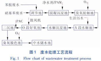 苯胺、硝基苯綜合廢水中含有大量難降解有機(jī)物,COD 值較高,可生化性極差(一般B /C 值為0 ~0.1) ,屬于高含鹽廢水,因此綜合考慮多種因素,決定采用物化與生化處理相結(jié)合的工藝。以混凝沉淀和臭氧氧化作為預(yù)處理單元,不會(huì)提高廢水的含鹽量,但可以提高廢水的可生化性,使A/O 生物系統(tǒng)處理效率大幅提高; 在末端再進(jìn)行臭氧氧化脫色處理可確保出水色度達(dá)標(biāo)。工藝流程見圖1。