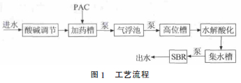 實(shí)驗(yàn)流程見圖1。氣浮柱為D 100 mm×1 500 mm的有機(jī)玻璃柱,采用壓力溶氣罐產(chǎn)生溶氣水。厭氧處理裝置采用兩根直徑為100 mm有機(jī)玻璃柱串聯(lián),內(nèi)置懸掛式纖維填料,整個(gè)裝置放于恒溫箱內(nèi),維持溫度在35 ℃。SBR 反應(yīng)器采用兩根尺寸為D 200 mm×1 200 mm 有機(jī)玻璃柱,每根有效容積約為20 L。