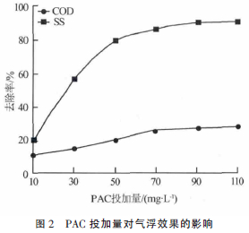 從圖2 可以看出,隨著PAC 投加量的增加,氣浮池出水中COD 與SS 的去除率都逐步增加。當(dāng)PAC 投加量為70mg/L 時(shí),COD 去除率能夠達(dá)到25%。隨著PAC 投加量的繼續(xù)增加,COD 與SS 的去除率增加幅度有限。考慮到工程運(yùn)行的經(jīng)濟(jì)性,確定PAC 投加量為70mg/L。