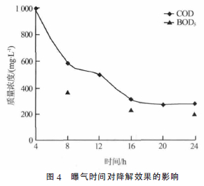 (2)曝氣時(shí)間對降解效果的影響。在曝氣階段的不同時(shí)間分別從曝氣池抽取部分混合液,沉淀60 min 后取上清液測定COD、BOD5,結(jié)果如圖4 所示。