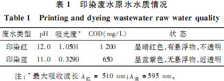 本實驗考察了FENTON試劑法與絮凝法相結合處理印染廢水的最佳實驗條件及所能達到的效果。實驗所處理的廢水取自某染襪廠的2種染料廢水(由于顏色存在差異,分別簡稱印染紅和印染藍),該印染廢水主要是由染襪過程中,各工序排出的廢水所組成。2種廢水的水質見表1。