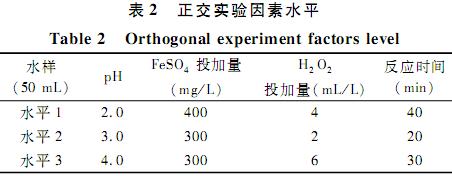 在對實際廢水初步研究的基礎上,參考了一些文獻,綜合考慮各種因素設計了以反應時間、雙氧水投加量、硫酸亞鐵投加量及pH值為變量的4因素3水平的正交實驗如表2所示,實驗采用的水樣類型為印染紅廢水,實驗結果列于表2。具體參見http://www.bnynw.com更多相關技術文檔。