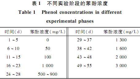 本實驗通過逐步提高系統進水苯酚濃度的方式,研究苯酚對好氧顆粒污泥系統的影響。表1為不同實驗階段的苯酚濃度值,其中24~28d階段內苯酚每日增加100mg/L。