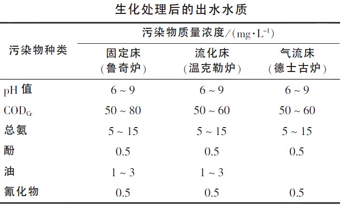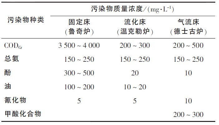 三種氣化工藝產(chǎn)生的廢水,氨含量均很高;固定床工藝產(chǎn)生的酚含量高,其它兩種較低;固定床工藝焦油含量高,其它兩種較低;氣流爐工藝中產(chǎn)生的甲酸化合物較高,其它兩種工藝基本不產(chǎn)生;氰化物在三種工藝中均產(chǎn)生;有機(jī)污染物COD,固定床工藝產(chǎn)生最多,污染最嚴(yán)重,其它兩種工藝污染較輕。