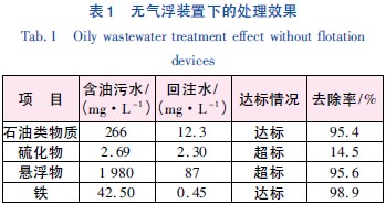 目前,部分聯(lián)合站僅采用黑核桃殼過濾器+ 纖維球過濾器系統(tǒng)處理含油污水。在本次研究中,首先關閉氣浮裝置運行含油污水處理系統(tǒng),進、出水水質(zhì)見表1。可見無氣浮狀態(tài)下,對石油類物質(zhì)、硫化物、懸浮物、鐵的去除率分別為95.4%、14.5%、95.6%、98.9%; 回注水懸浮物和硫化物濃度未達到《長慶油田污水回注指標控制標準》。