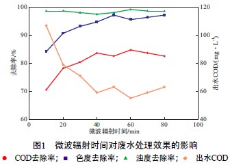 當(dāng)PAC加入量為200 mg/L、PAM加入量為3mg/L、廢水pH=3、FeSO4加入量為250 mg/L、H2O2加入量為1 200 mg/L、微波功率為400 W時,微波輻射時間對廢水處理效果的影響見圖1。由圖1可見:濁度去除率一直維持在95%以上;微波輻射時間為0~50 min時,色度去除率逐漸增大;微波輻射時間為0~40 min時,COD去除率逐漸增大;隨著時間繼續(xù)延長,由于H2O2含量降低、Fe2+轉(zhuǎn)化為Fe3+,因此COD去除率有所減小;當(dāng)微波輻射時間為60 min時,COD、色度、濁度去除率和出水COD分別為84.78%,95.55%,99.16%, 55.34 mg/L。因此,選擇最佳微波輻射時間為60 min。