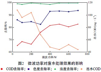 當(dāng)PAC加入量為200 mg/L、PAM加入量為3mg/L、廢水pH=3、FeSO4加入量為250 mg/L、H2O2加入量為1 200 mg/L、微波輻射時間為40 min時,微波功率對廢水處理效果的影響見圖2。由圖2可見:濁度去除率一直維持在95%以上;當(dāng)微波功率在300~400 W時,色度去除率顯著提高;當(dāng)微波功率在200~500 W時,COD去除率明顯增大。微波發(fā)生器采用溫度反饋法調(diào)節(jié)微波輸出功率,當(dāng)微波功率低于300 W時,廢水的溫度未上升;當(dāng)微波功率超過400 W時,廢水的溫度迅速升溫到設(shè)定值50 ℃,有利于Fenton反應(yīng)生成自由基·OH。當(dāng)微波功率為500 W時,出水COD最低,為64 mg/L。因此,選用微波功率為500 W。