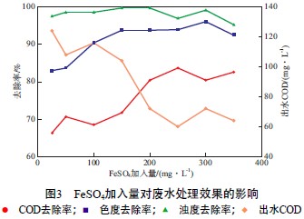 當(dāng)PAC加入量為200 mg/L、PAM加入量為3mg/L、廢水pH=3、 H2O2加入量為1 200 mg/L、微波功率為400 W、微波輻射時間為40 min時, FeSO4加入量對廢水處理效果的影響見圖3。由圖3可見:濁度去除率始終維持在90%以上;FeSO4加入量為0~300 mg/L時,色度去除率明顯增大;當(dāng)FeSO4加入量在100~250 mg/L時,COD去除率增大,但隨后降低,這是因為FeSO4濃度過高時,F(xiàn)enton反應(yīng)速率過大,部分·OH與Fe2+反應(yīng)生成OH-,F(xiàn)e3+與H2O2反應(yīng)生成氧化性較低的·OH2;當(dāng)FeSO4加入量為250 mg/L時,COD去除率最高,為83.70%,出水COD為60.00 mg/L。因此,確定最佳FeSO4加入量為250 mg/L。