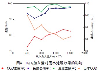 當(dāng)PAC加入量為200 mg/L、PAM加入量為3mg/L、廢水pH=3、FeSO4加入量為250 mg/L、微波功率為400 W、微波輻射時間為40 min時,H2O2加入量對廢水處理效果的影響見圖4。由圖4可見:色度和濁度去除率一直維持在90%以上;H2O2加入量為1 400 mg/L時,COD去除率最高,為83.70%,出水COD為60.00 mg/L。因此,確定H2O2加入量為1 400 mg/L。