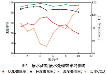 當(dāng)PAC加入量為200 mg/L、PAM加入量為3mg/L、FeSO4加入量為250 mg/L、H2O2加入量為1 200 mg/L、微波功率為400 W、微波輻射時間為40 min時,廢水pH對廢水處理效果的影響見圖5。由圖5可見:濁度去除率維持在95%以上;色度去除率也在90%左右;當(dāng)廢水pH=3~5時,COD去除率增大,當(dāng)廢水pH=5~10時,COD去除率降低。pH過高,OH-與Fe2+和Fe3+生成沉淀,減弱Fe2+的催化作用;pH過低,H+抑制H2O2還原Fe3+ ,降低反應(yīng)·OH的生成。當(dāng)廢水pH=5時,COD去除率最高,為85.87%,出水COD為51.59 mg/L。因此,確定廢水pH最佳值為5。