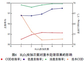 當(dāng)PAC加入量為200 mg/L、PAM加入量為3 mg/L、廢水pH=3,F(xiàn)eSO4加入量為250 mg/L、H2O2總加入量為1 200 mg/L、微波功率為400 W、微波輻射時間為40 min時,H2O2投加次數(shù)對廢水處理效果的影響見圖6。由圖6可見:濁度去除率一直維持在96%以上;當(dāng)H2O2投加次數(shù)增多時,色度、COD去除率均明顯提高,多次投加H2O2的處理效果優(yōu)于一次投加效果。H2O2多次投加可以提高反應(yīng)的平均推動力,加快主反應(yīng)速率,抑制副反應(yīng)。H2O2投加次數(shù)為3時,COD去除率最高,為85.81%,出水COD為52.21 mg/L。因此,確定投加H2O2最佳次數(shù)為3。