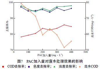 由圖7可見:濁度和色度去除率維持在90%以上;隨PAC加入量增加,COD去除率增大;PAC的加入量過大時,廢水中剩余的Cl-消耗部分·OH自由基,導(dǎo)致出水COD增大;當(dāng)PAC加入量為350 mg/L時,COD去除率最高,為85.87%,出水COD為51.59 mg/L。經(jīng)實驗確定PAC的加入量為350 mg/L。