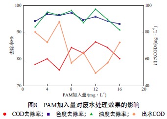 當(dāng)PAM加入量為3 mg/L、廢水pH=3、FeSO4加入量為250 mg/L、H2O2加入量為1 200 mg/L、微波功率為400 W、微波輻射時間為40 min時,PAC加入量對廢水處理效果的影響見圖7。