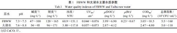 試驗在蘇州市某水廠中試基地內進行。FBWW與太湖原水的水質參數見表1 所示。