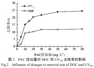 PAC 吸附強化混凝試驗結果表明,混凝過程進行到20~25 min 投加PAC 對DOC 和UV254有較好的去除效果,此時PAC 吸附時間為30~35 min。