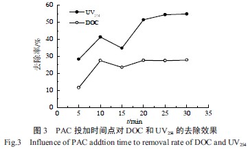 分別在混凝進行至5、10、15、20、25、30 min 時投加PAC,混凝結束后后分析上清液UV254和DOC 去除率,確定PAC 最佳投加時間點。結果如圖3 所示。