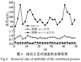 由圖4 可知,FBWW 原水的濁度在60.5~151.0 NTU,平均為91.5 NTU,在凈水廠沉淀池中未被去除的大量礬花被截留在砂濾池中,因此FBWW具有較好的沉降性能,取樣時間和放置時間的不同導致其濁度波動較大。混凝+PAC 出水濁度在0.65~1.0 NTU,平均為0.75 NTU,說明混凝+PAC可以顯著去除FBWW 中的懸浮顆粒物,減輕后續UF 處理負荷。UF 出水濁度在0.1~0.19 NTU,平均為0.14 NTU,平均去除率為99.8%,該組合工藝對濁度去除效果顯著。這是因為混凝以去除水中的膠體和細小懸浮物為主,在一定含量范圍內投加的PAC顆粒物質均會被混凝去除。UF 出水濁度均保持在較低水平,這表明UF 膜可有效地截留混凝形成的礬花、攔截PAC 顆粒物質等污染物質。