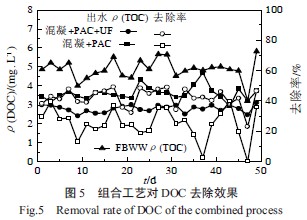 DOC 包含的碳通過燃燒或化學氧化轉化成二氧化碳,因此通過紅外吸收測定了二氧化碳的量,表征了水體受溶解性有機物污染的程度。混凝可以通過吸附電中和、架橋、網捕等作用去除DOC,PAC 主要通過物理吸附作用去除DOC,另外,UF 膜對有機物的去除主要通過篩分和吸附作用。試驗組合工藝在PAC 投加量為15 mg/L 時對DOC 的去除效果的如圖5 所示。