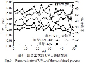 組合工藝各階段出水的UV254去除情況如圖6所示。FBWW原水的UV254為0.044~0.076 cm-1,平均0.063 cm-1。