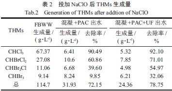 THMFP 是指水樣在一定加氯反應條件下生成三鹵甲烷(THMs)的量,表征了該水樣在后續消毒過程中產生THMs 的能力。本試驗THMFP 的測定方法如下:向待處理水樣中投加量為10 mg/L 的NaClO,然后用磷酸緩沖溶液調節pH 至7,恒溫無光靜置培養24 h 以保證THMs 生成反應完全,所檢測THMs 生成量如表2 所示,其中去除率為組合工藝各階段出水相較于FBWW的去除率。