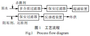 超濾-反滲透工藝由于其良好的去除有機物、濁度、脫色脫鹽等特點,已經廣泛被用于污水回用試驗研究和工程實踐,并取得了顯著的成效。曾杭成等利用超濾-反滲透工藝處理高含鹽性、可生化性差的印染廢水,結果表明,超濾為預處理單元去除廢水的濁度和大分子有機物,使反滲透的進水水質穩定,反滲透單元對有機物和鹽的去除率分達99%和93%。徐竟成等采用了微濾-反滲透工藝處理深度處理印染廢水,結果表明,反滲透系統對總硬度、氯化物、硫酸根和鈉離子的去除率分別為90%、95%、90%、95%以上,產水電導率小于150 μS/cm,脫鹽率達到95%以上。尹曉峰介紹了反滲透技術在河北省某發電廠蒸汽鍋爐給水/ 補給水處理系統中的工程應用實例,工程用多介質過濾器-反滲透-混床的組合工藝對原水進行脫鹽處理,效果顯著,運行穩定。